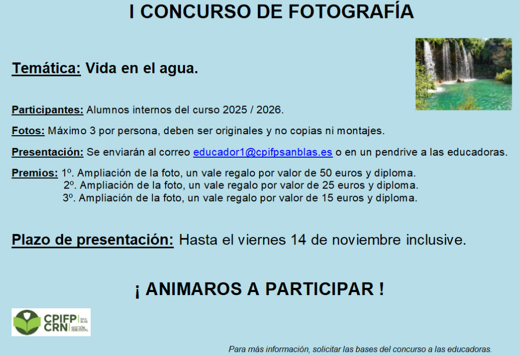 Ya podéis enviar vuestras fotos para participar en el I Concurso de fotografía de la Residencia CPIFP San Blas del curso 25/26. Aquí tienes toda la información:
